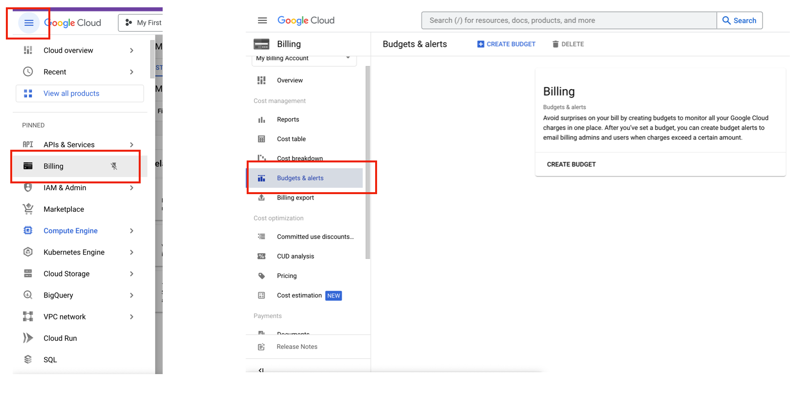 - 좌상단 메뉴에서 Billing → Budgets & alerts로 이동해서 Budgets을 생성합니다.