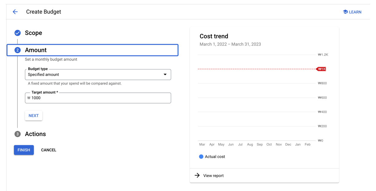 - 가난한 개발자는 걱정이 많습니다. 혹시 실수로 요금이 청구되는 사태를 미연에 방지하기 위해 Billing 예산을 설정하고, alert를 받을 수 있도록 설정가능합니다.