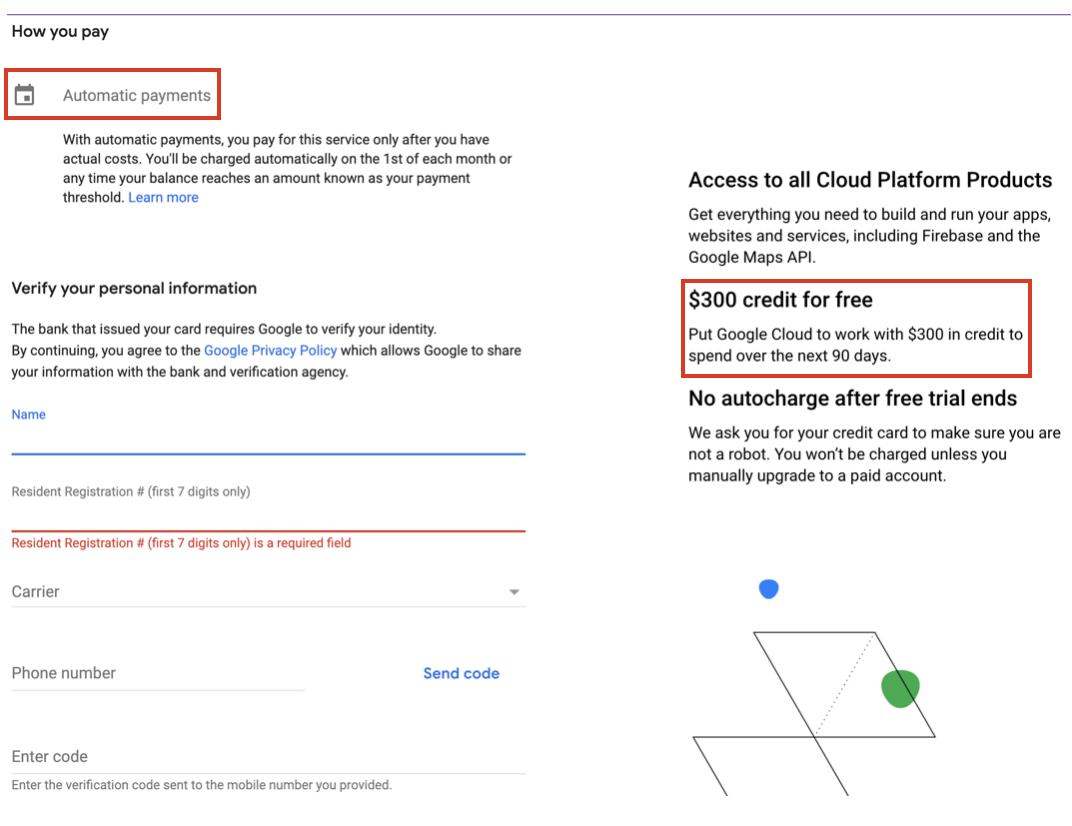 가입시 지불옵션(카드정보)를 입력해야 하지만, 300$의 무료 크레딧을 지급해주기 때문에, 설정을 잘못해서 청구될 수 있다는 부담없이 시작해보기 좋습니다.